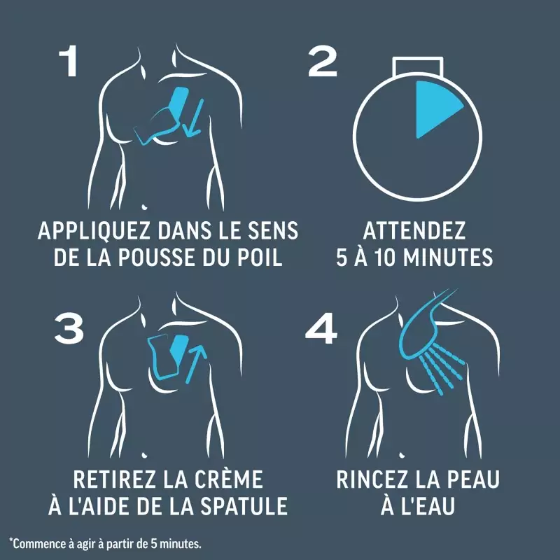 Citiți și urmați toate instrucțiunile importante înainte de utilizare. Aplicați crema uniform, astfel încât părul să fie acoperit complet. Efectul începe după 3 minute. După 3 minute, testați o zonă mică pentru a vedea dacă părul poate fi deja îndepărtat. Dacă este necesar, lăsați crema să acționeze pentru încă câteva minute, dar nu mai mult de 6 minute în total. Apoi îndepărtați crema și clătiți bine pielea cu apă.