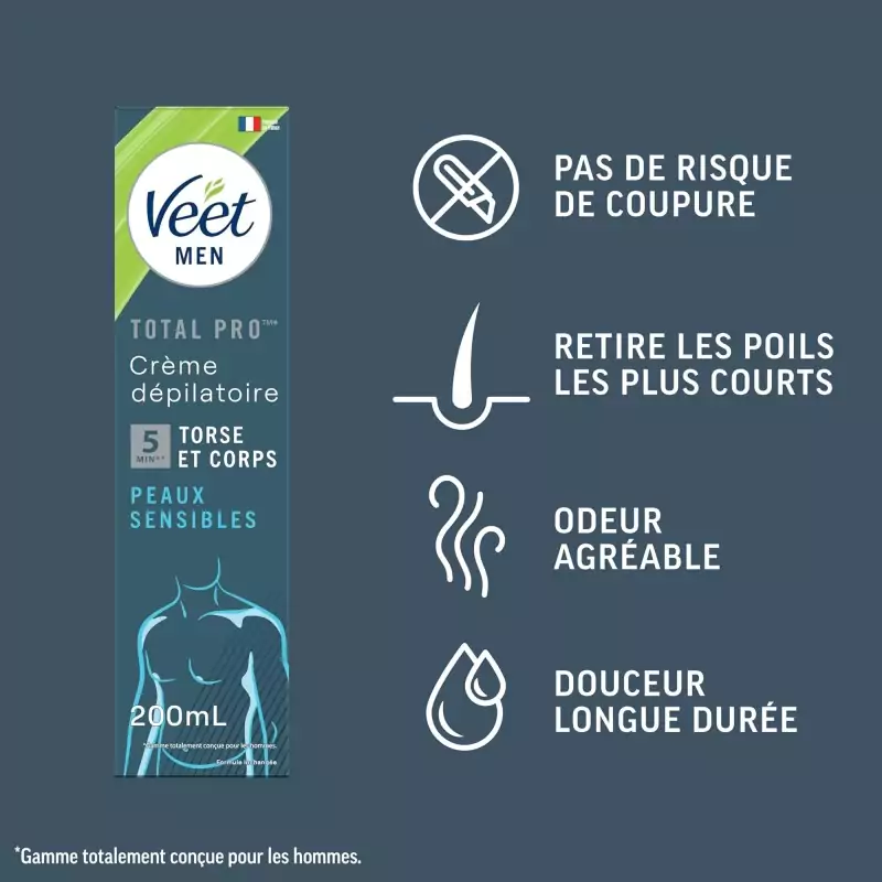 Crema de îndepărtare a părului Veet Men Total Pro™ a fost special dezvoltată pentru nevoile pielii bărbaților. Aceasta îndepărtează părul nedorit de pe corp rapid și eficient. Crema asigură o piele vizibil netedă, hidratează timp de până la 24 de ore și permite îndepărtarea părului de pe partea superioară a corpului și de pe picioare fără riscul de tăieturi, așa cum se poate întâmpla în cazul bărbieritului.