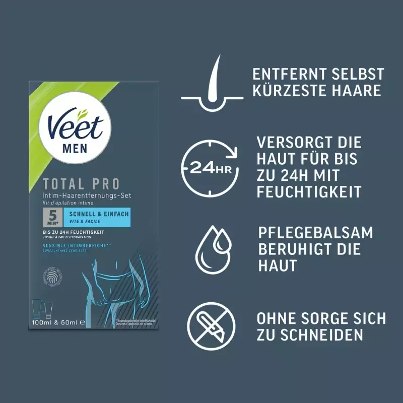 Veet Men Total Pro™ Intimate Hair Removal Set a fost special dezvoltat pentru utilizarea în zonele intime sensibile. Combinația de cremă depilatoare pentru zona intimă și balsam de îngrijire cu aloe vera permite îndepărtarea completă a părului fără riscul de tăieturi, așa cum se poate întâmpla în cazul bărbieritului. Rezultatul este o piele netedă și bine îngrijită în doar câteva minute. Ca și cremă depilatoare pentru zona intimă, setul este adaptat la cerințele speciale ale pielii sensibile și este ideal ca și cremă depilatoare pentru bărbați.