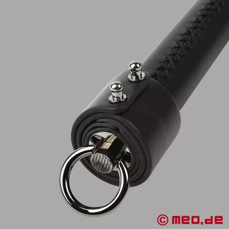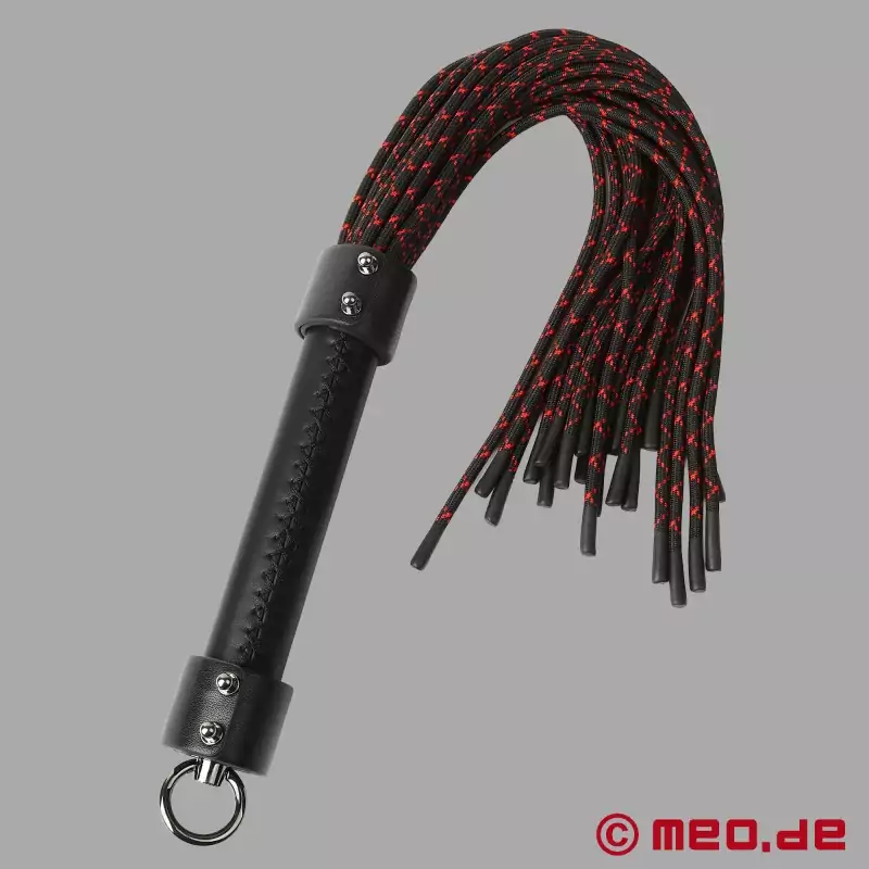Mânerul subțire cu cusături încrucișate stă bine și confortabil în mână, astfel încât să puteți ghida cu precizie flogger-ul chiar și atunci când îl folosiți pentru perioade mai lungi de timp. Aspectul negru și roșu al firelor stabilește un accent clar dominant și este intimidant la vedere. La capătul mânerului există un inel metalic robust, care facilitează agățarea flogger-ului sau atașarea acestuia la curea.