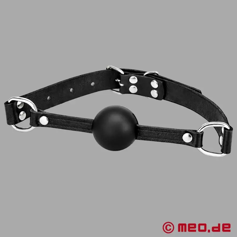 Dimensiunea călușului cu bilă este selectabilă: 40 mm sau 50 mm diametru, ceea ce îmbunătățește confortul și adaptabilitatea. Ball gag-ul este montat pe o curea din piele reglabilă flexibil, care se adaptează perfect la orice dimensiune a capului și asigură o fixare sigură. Cu o lungime totală de aproximativ 58 cm, călușul cu bilă se adaptează la diferite forme și circumferințe ale capului.