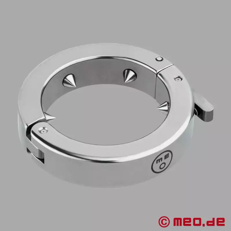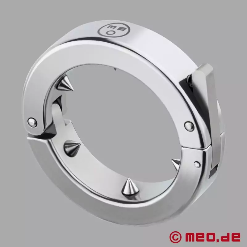 As I inspected the stainless steel ring over I couldn't help but notice the solid six spikes firmly surrounding the circumference of the inner steel. Opening the ring up is done by releasing the clasp where there is a strong hinge positioned on the bottom of the glans ring. The outer edge of the ring has a shiny finish to the steel; there is the MEO logo to complete the ring appearance.
