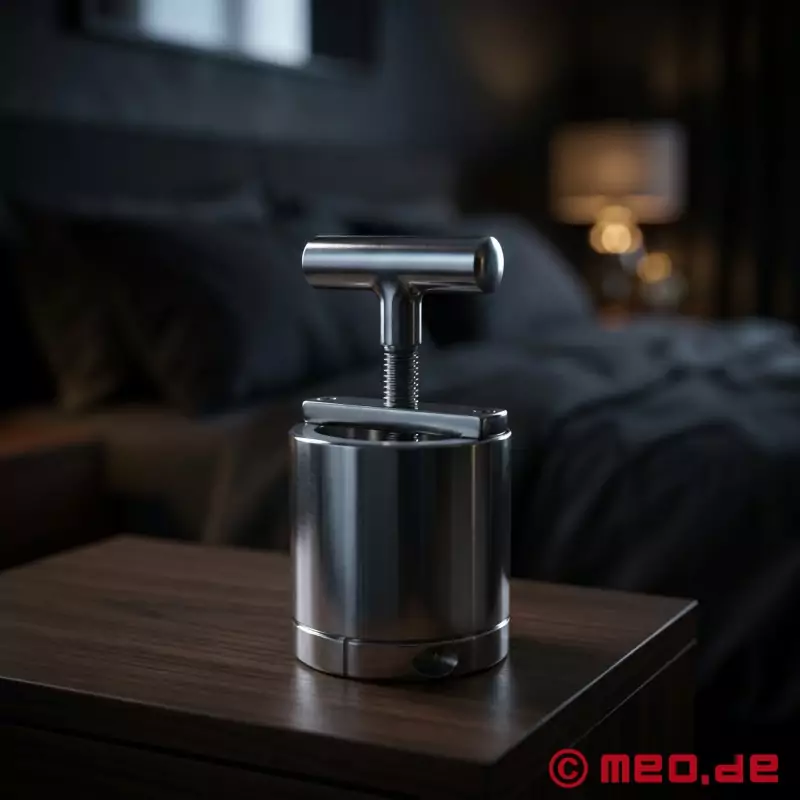 Dispozitivul CBT "Chamber of Dread" poate fi utilizat pentru a exercita o presiune specifică folosind o combinație de inel testicular, cilindru de oțel și fus.