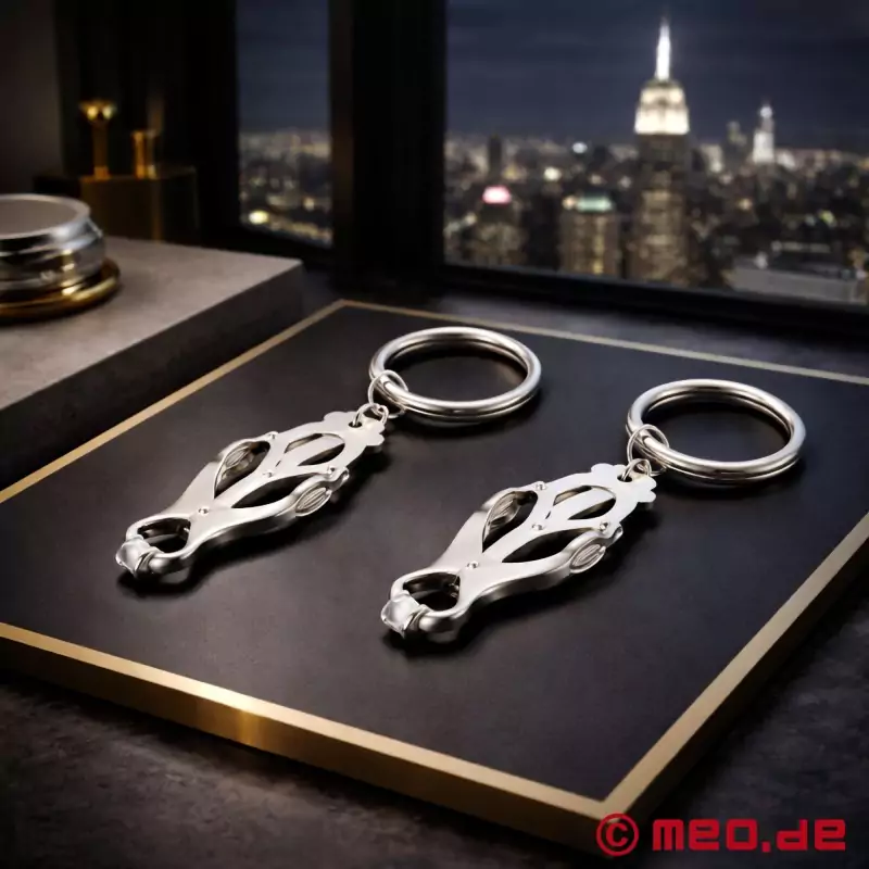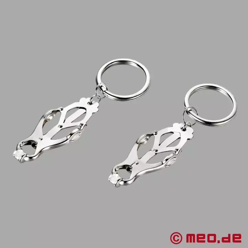 Clover Clamps sunt cleme japoneze pentru mameloane, un clasic printre jucăriile BDSM, cu un inel pentru atașarea greutăților, frânghiilor sau lanțurilor. Funcționalitatea clemelor noastre Clover Clamps cu inele de ghidare oferă o senzație copleșitoare de durere.