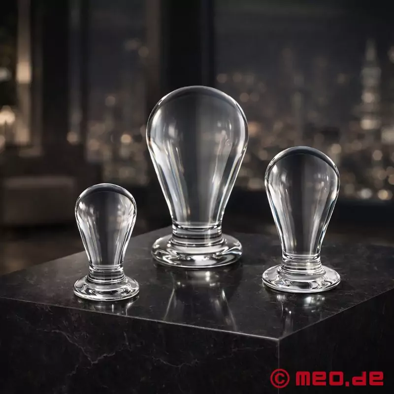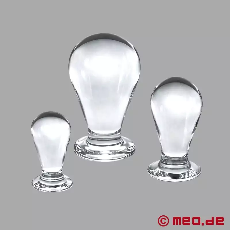 Cu acest set de dilatare anală, vă puteți antrena anusul pentru tot pumnul! Dopurile noastre anale pentru dilatare anală permanentă impresionează prin forma lor anatomică perfectă și materialul excepțional: sticla borosilicată incasabilă pe care o folosim are o suprafață fină ca o oglindă și este deosebit de ușor de introdus în anus. Cu câteva picături de EZ2FUCK, lubrifiantul pe bază de silicon de la MEO, chiar și cel mai mare dintre cele trei dopuri anale poate fi introdus fără probleme.