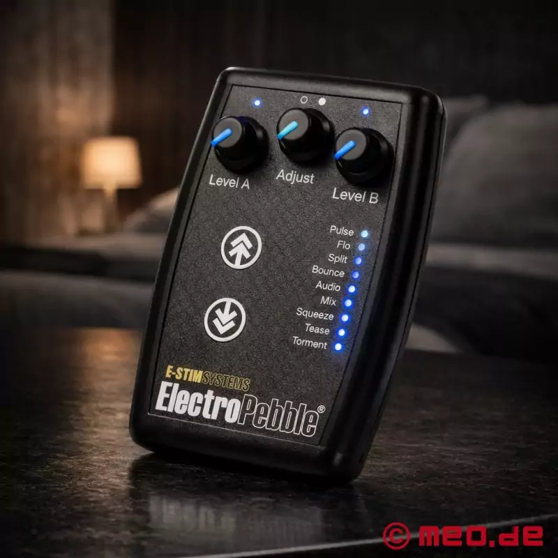 Dispozitivul de electrostimulare ElectroPebble™ de la E-Stim Systems este ideal pentru BDSM, deoarece are două canale care pot stimula simultan mai multe părți ale corpului și nouă programe (de exemplu, mulgere, durere, răsfăț) care oferă o varietate de senzații diferite. Modul audio oferă E-Stim-ului o dimensiune suplimentară, uluitoare, în contextul BDSM.