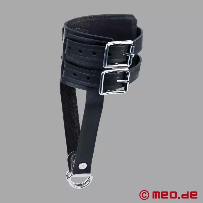Acest extensor testicular din piele nu impresionează doar prin designul său (design fabricat în Germania), ci și prin calitatea sa și asigură o plăcere uluitoare cu multă tracțiune. Greutatea ușor de atașat este responsabilă pentru întinderea scrotului. Cu cât este mai greu extensorul testicular, care este purtat peste testicule pe scrot, cu atât mai mult testiculele sunt trase în jos. În plus, forma și dimensiunea extensorului testicular cu bilă din piele asigură o anumită întindere. Atât începătorii, cât și utilizatorii avansați pot folosi acest extensor testicular din piele BDSM pentru a strânge scrotul și penisul și a se bucura de această senzație intensă.