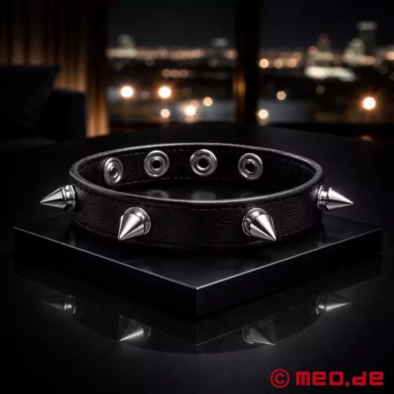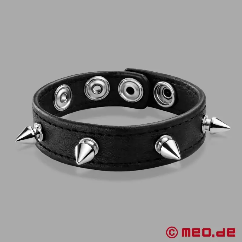 Masculin, izbitor și orice, dar nu obișnuit: acest cockring realizat din piele de vită neagră cu țepi argintii este o declarație de încredere în sine cu un efect clar. Pielea de vită neagră întâlnește țepușe argintii și creează un look cu aspect dominant. În același timp, face penisul să pară mai mare și îl evidențiază impresionant.