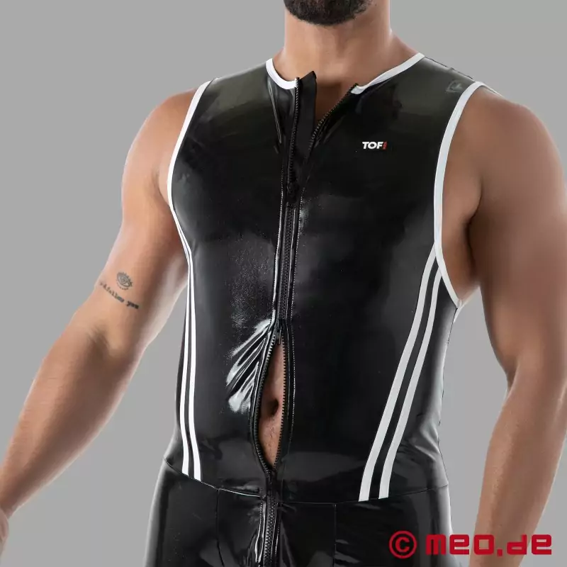 Pentru toți cei care nu numai că vor să facă o declarație de modă - dar sunt și pregătiți pentru sex spontan în orice moment: Latex Full Zip Body negru din latex este la fel de erotic pe cât este de practic. Body-ul se potrivește ca o a doua piele, subliniază silueta și creează un efect wow instantaneu. Fermoarul pe toată lungimea, de la gât până jos, stabilește un accent puternic, funcțional, în timp ce liniile albe contrastante accentuează designul într-un mod sportiv, grafic. O bandă de protecție internă sub fermoar împiedică prinderea pielii sau a părului și asigură un confort sporit. Conceput și fabricat în Paris, Franța.