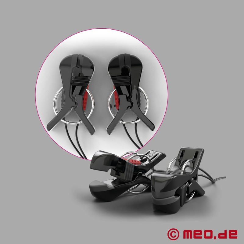Die hochwertig verarbeiteten Klemmen für die Elektrostimulation sind mit einer Feder ausgestattet, die einen festen Griff garantiert, egal ob sie die Klemmen an Brustwarzen, Schamlippen, Hoden oder anderen Körperstellen anbringen möchten. Mittels einer Stellschraube lässt sich die Druckintensität der Klemmen regulieren. Da jede der Klemmen bi-polar ist, wird immer nur das Gewebe stimuliert, das exakt zwischen den beiden Hälften liegt, so ist auch die Stimulation beider Brustwarzen gleichzeitig gefahrlos möglich.